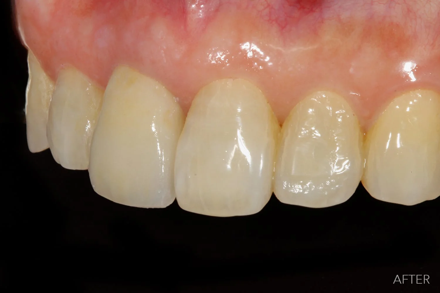 In order to save the tooth, a customized post was placed in the tooth to hold a porcelain crown. Customized staining for the crown ensured a good color match with the surrounding teeth.