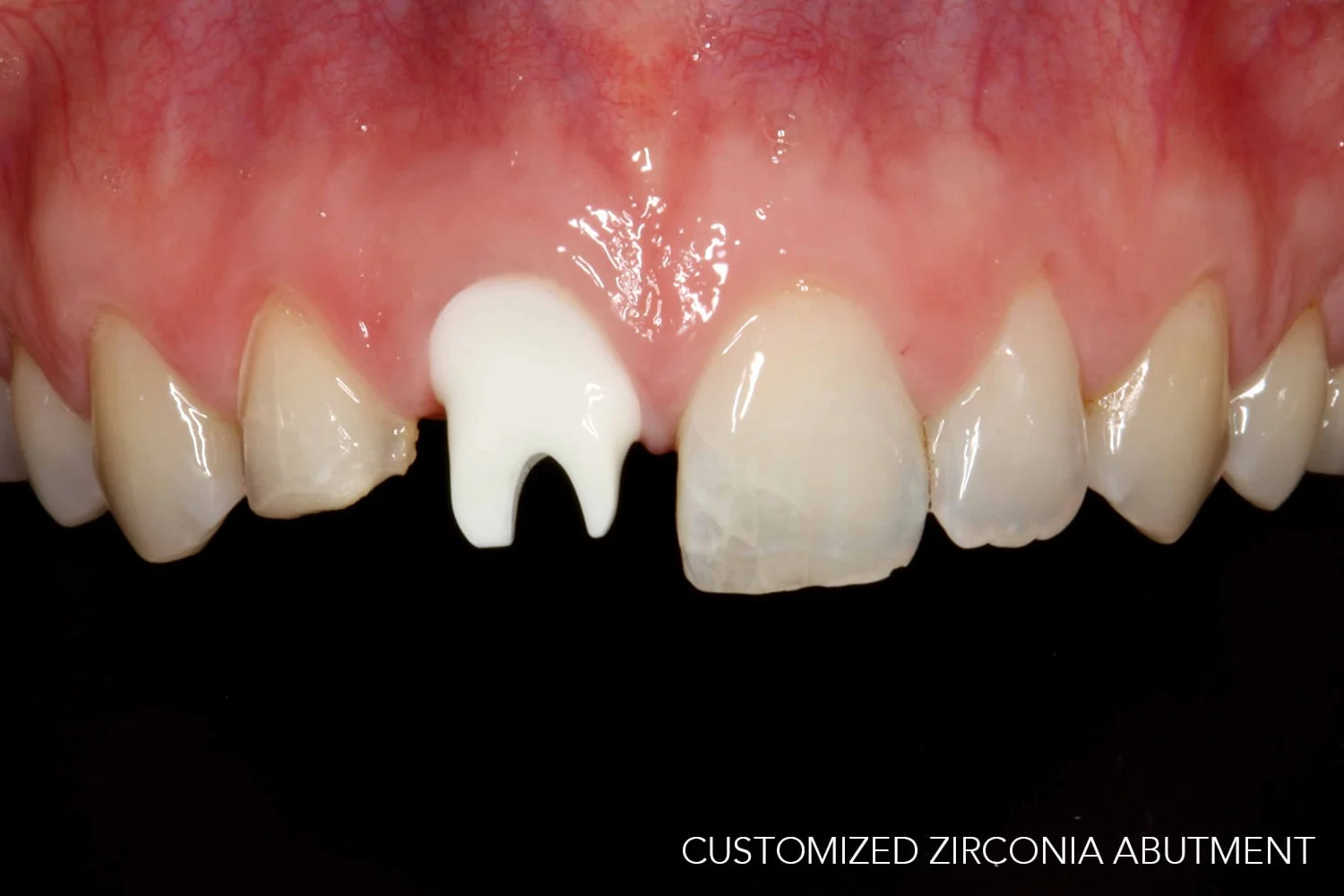 The front tooth was replaced by a single dental implant and the tooth next to it was restored with a porcelain veneer.
